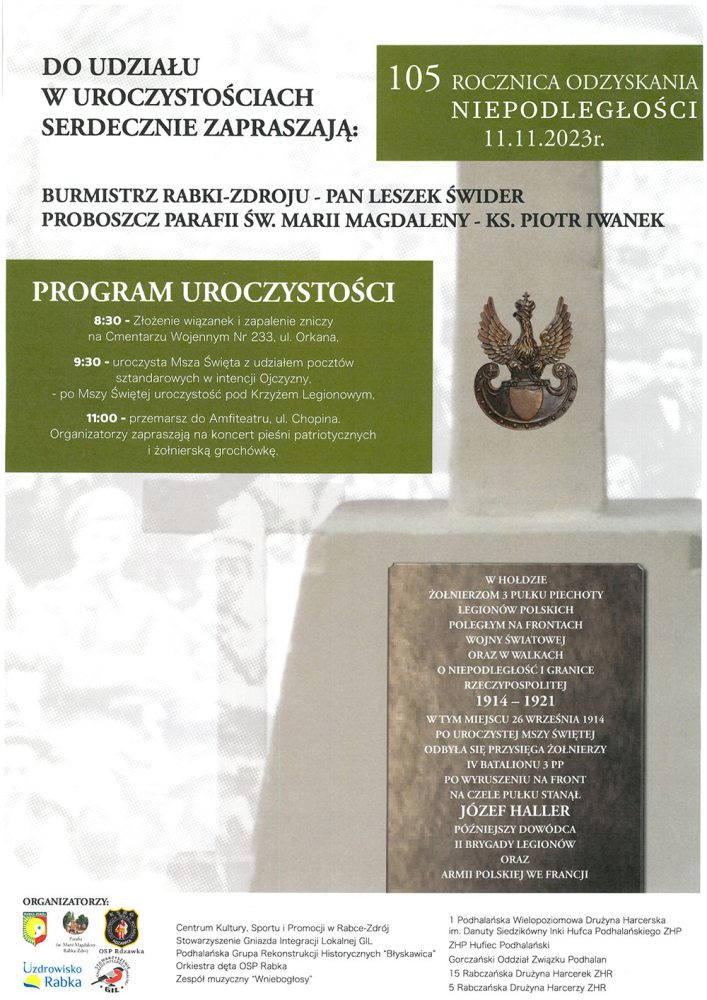 - godz. 9.30 – uroczysta Msza Św. z udziałem pocztów sztandarowych w intencji Ojczyzny, po mszy uroczystości pod Krzyżem Legionowym,