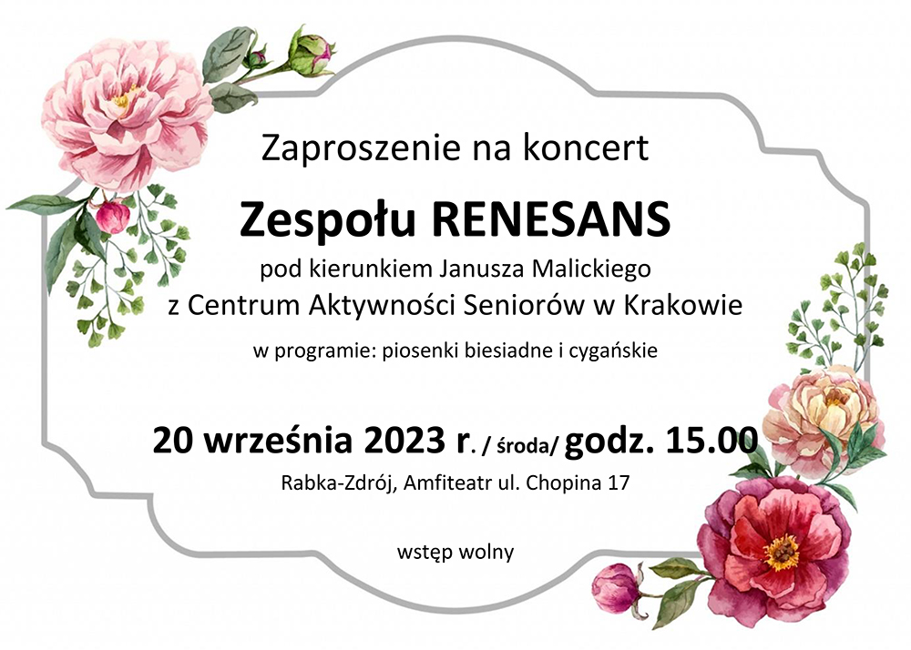 Centrum Kultury, Sportu i Promocji zaprasza 20 września br. o godz. 15.00 do Amfiteatru przy ul. Chopina 17 na koncert zespołu Renesans pod kierunkiem Janusza Malickiego z Centrum Aktywności Seniorów w Krakowie.