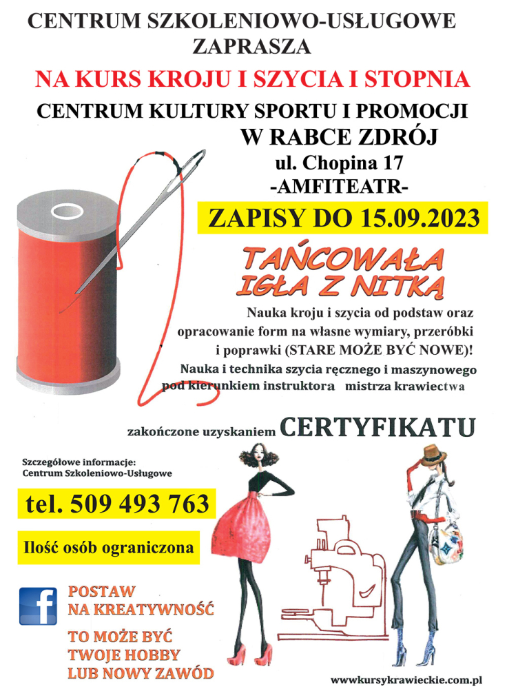 Centrum Szkoleniowo-Usługowe zaprasza na kurs kroju i szycia I stopnia zakończone uzyskaniem certyfikatu. Zajęcia będą się odbywać w Rabce-Zdroju przy ul. Chopina 17 (amfiteatr).